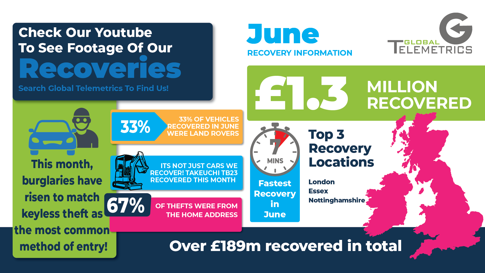 Glastonbury has come and gone, Black Sabbath are now retired but Oasis are back and ‘some might say’ that thieves are enjoying their summer a little less thanks to Global Telemetrics recovering £1.3m of stolen vehicles during June, taking our all time total to over £189m.